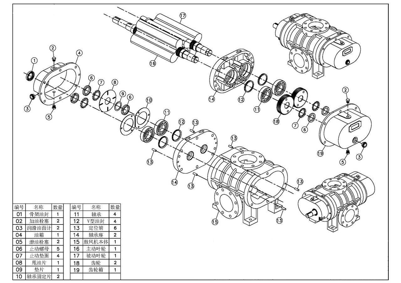 三葉羅茨風(fēng)機配件較多,內(nèi)部零配件包括:骨架油封、加油栓塞、潤滑油面計、郵箱、泄油栓塞、止動螺母、止動墊圈、甩油片、墊片、軸承固定片、軸承、V型油封、定位銷、軸承座、風(fēng)機主體、主動葉輪、被動葉輪、齒輪、齒輪箱;